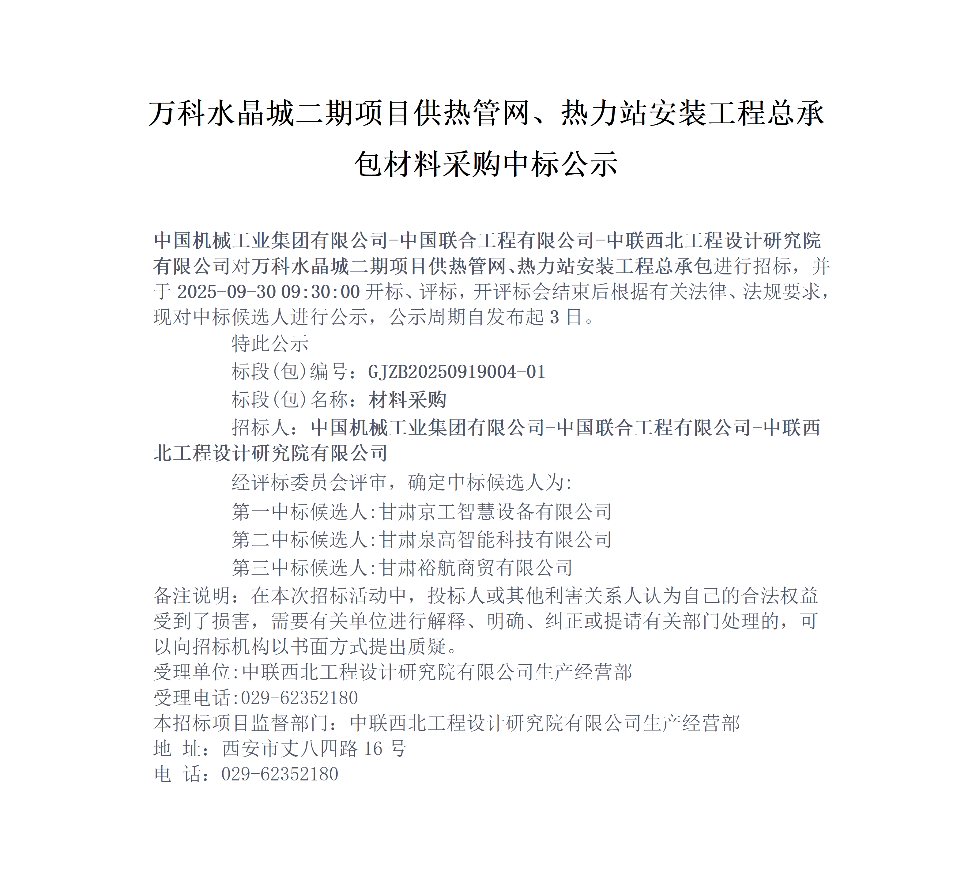 萬科水晶城二期項目供熱管網(wǎng)、熱力站安裝工程總承包材料采購中標公示
