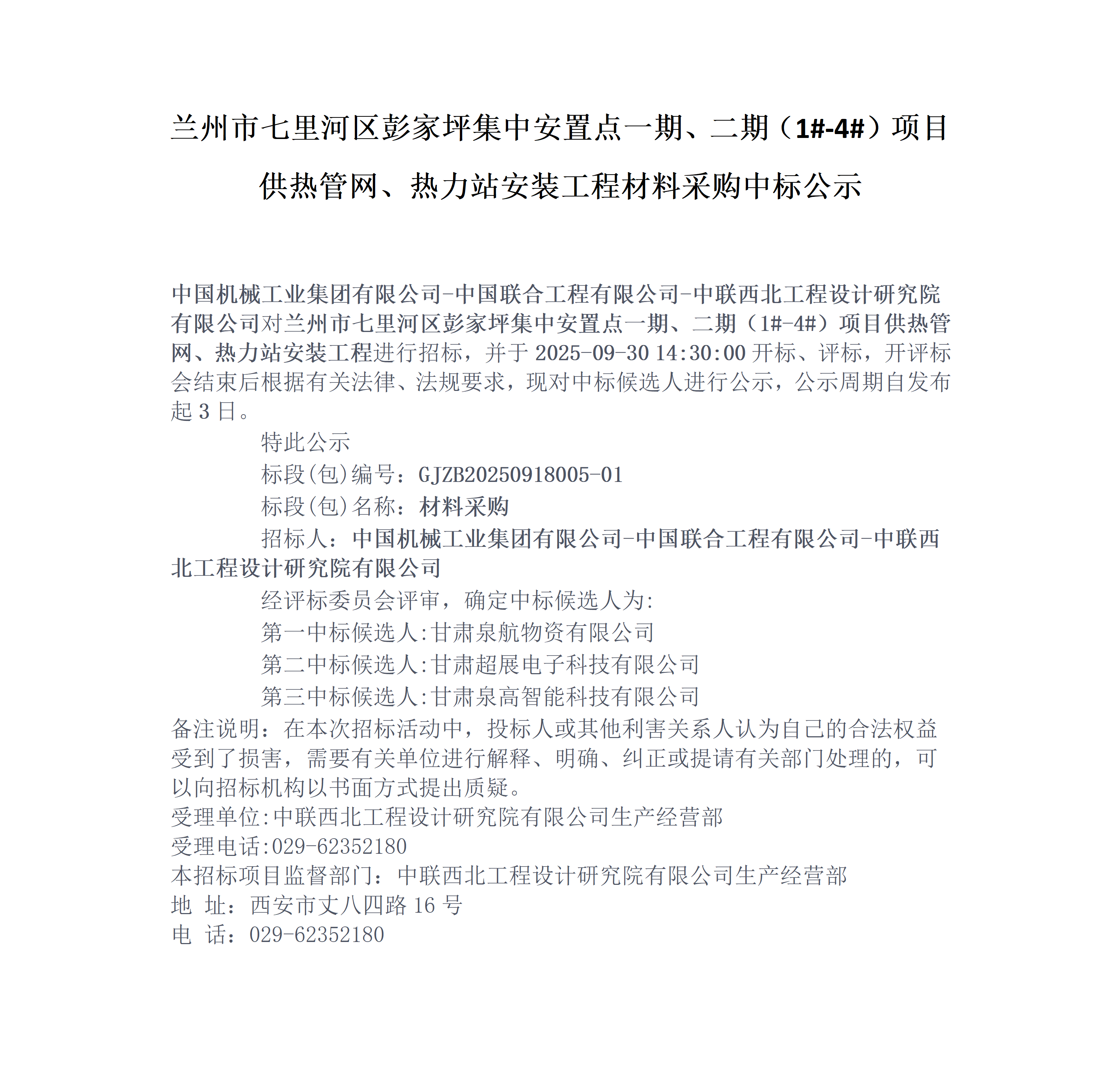 蘭州市七里河區(qū)彭家坪集中安置點一期、二期(1#-4#)項目供熱管網(wǎng)、熱力站安裝工程材料采購中標(biāo)公示
