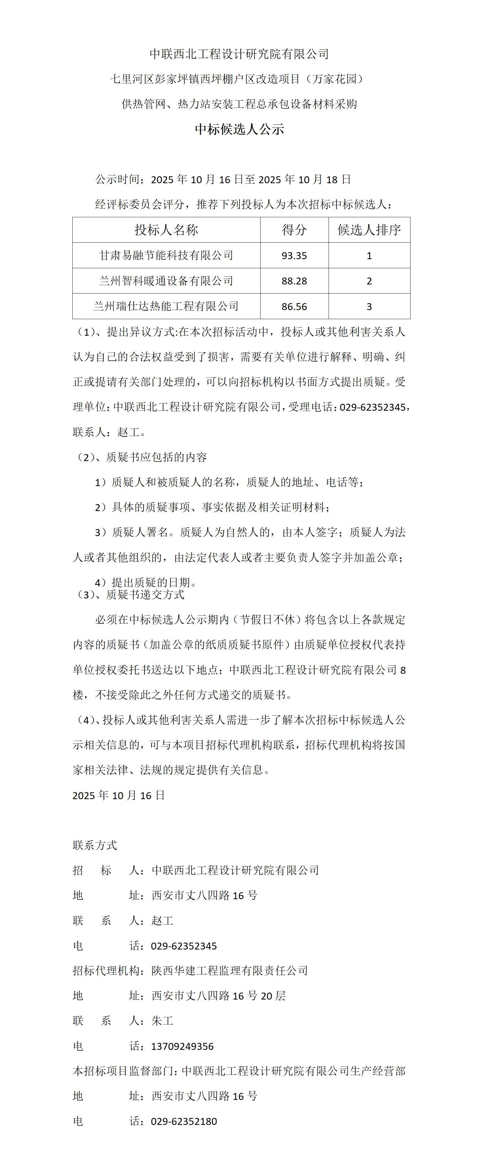 七里河區(qū)彭家坪鎮(zhèn)西坪棚戶(hù)區(qū)改造項(xiàng)目(萬(wàn)家花園)供熱管網(wǎng)、熱力站安裝工程總承包設(shè)備材料采購(gòu)中標(biāo)候選人公示